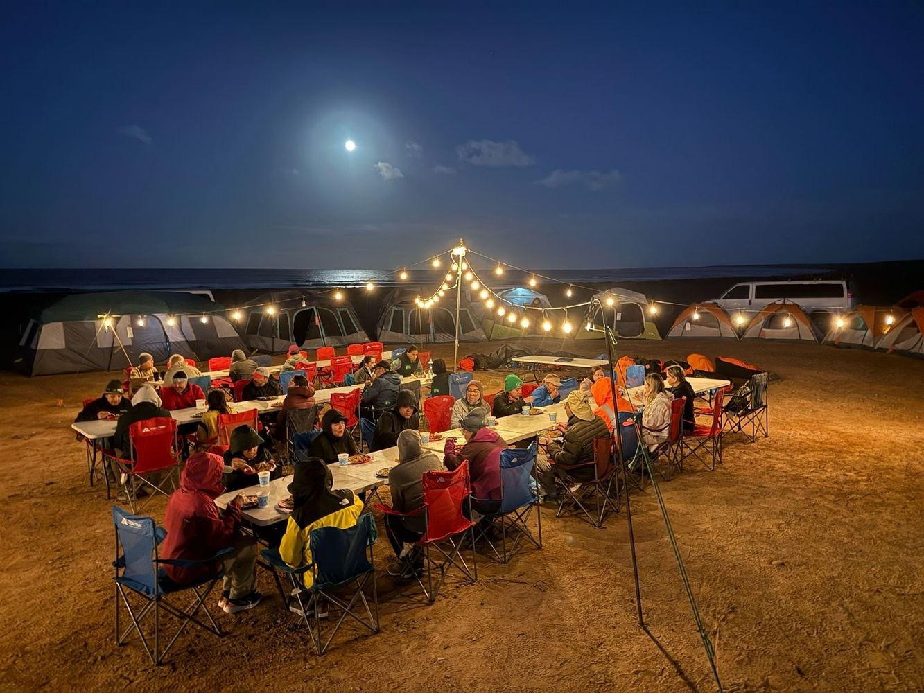 Desayuno: En campamento, huevos revueltos con salchicha, frijoles, opción de hot cakes, tortillas de maíz o harina, cereal, variedad de bebidas (jugos, agua fresca, café instantáneo o té)